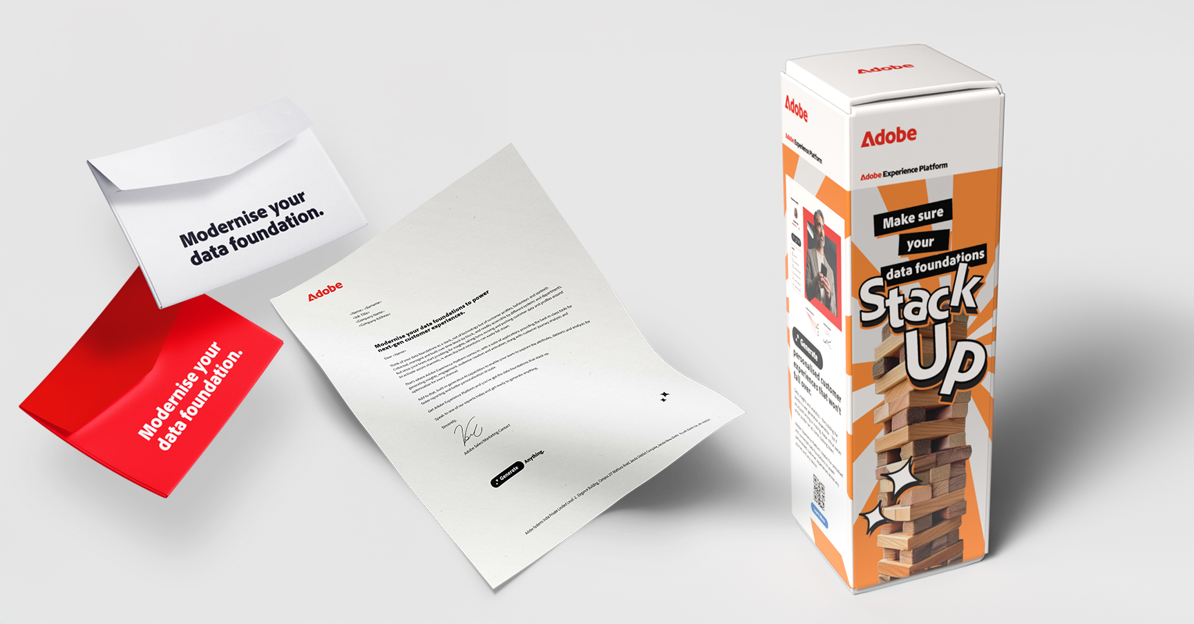 A playful yet pointed campaign that used a custom Jenga set to show how fragile data foundations can be without the right platform. By tying the metaphor to Adobe Experience Platform and amplifying it through OOH, digital ads, and a direct mail surprise, we turned a complex story about data into a tangible, memorable experience that drove leads and retention.