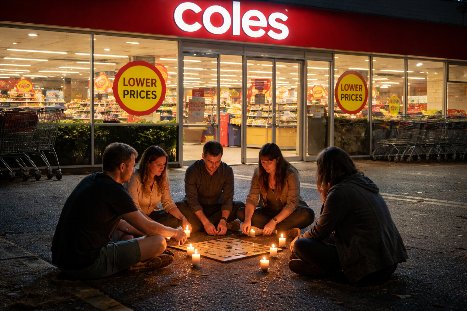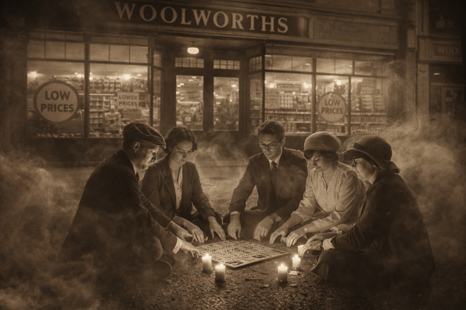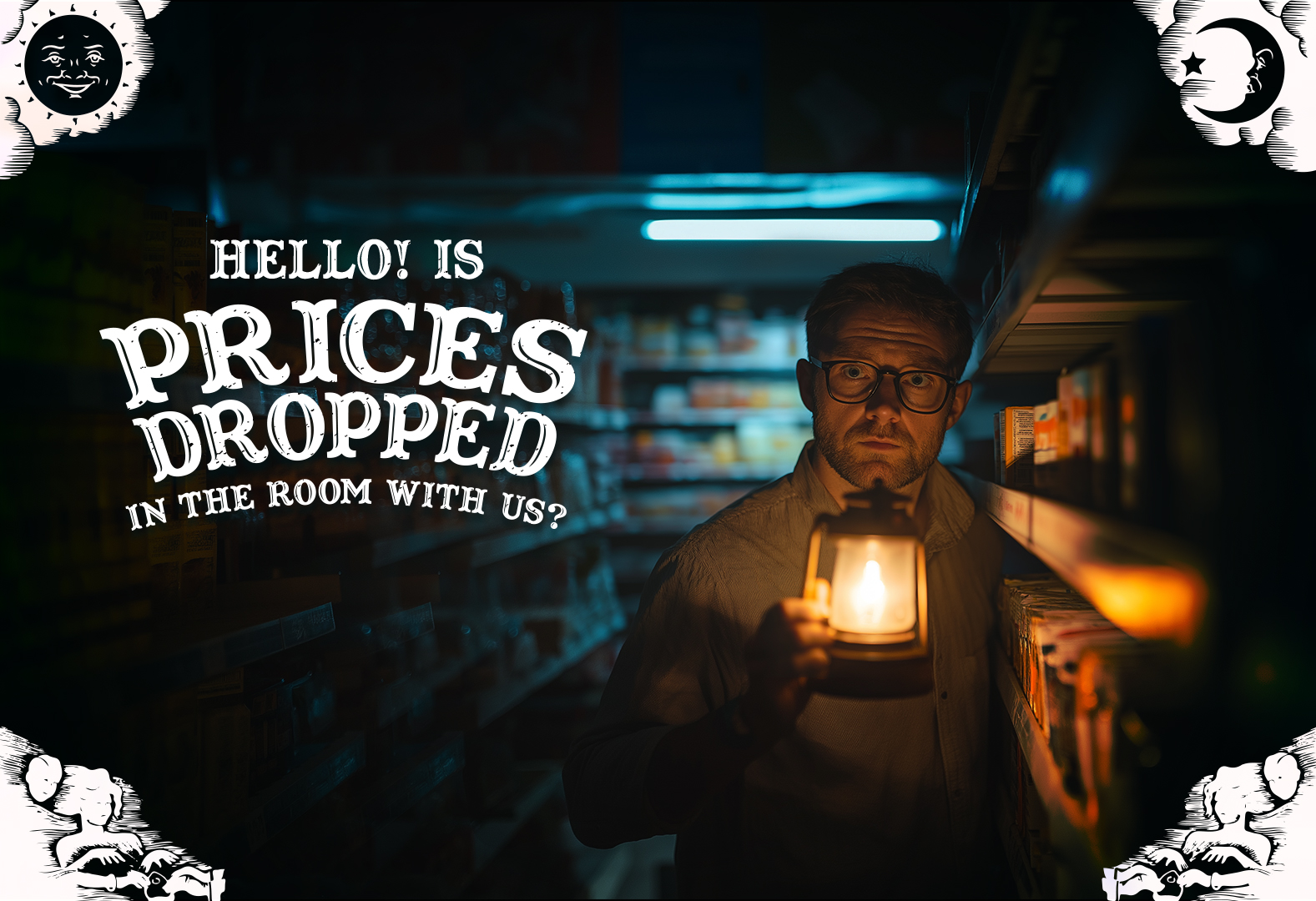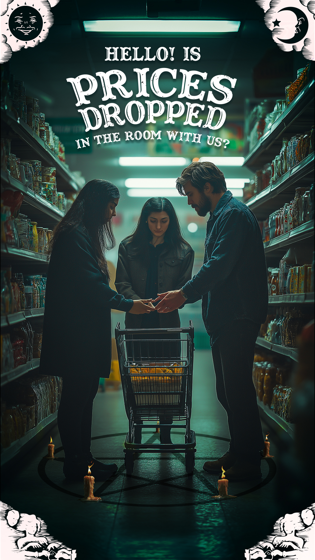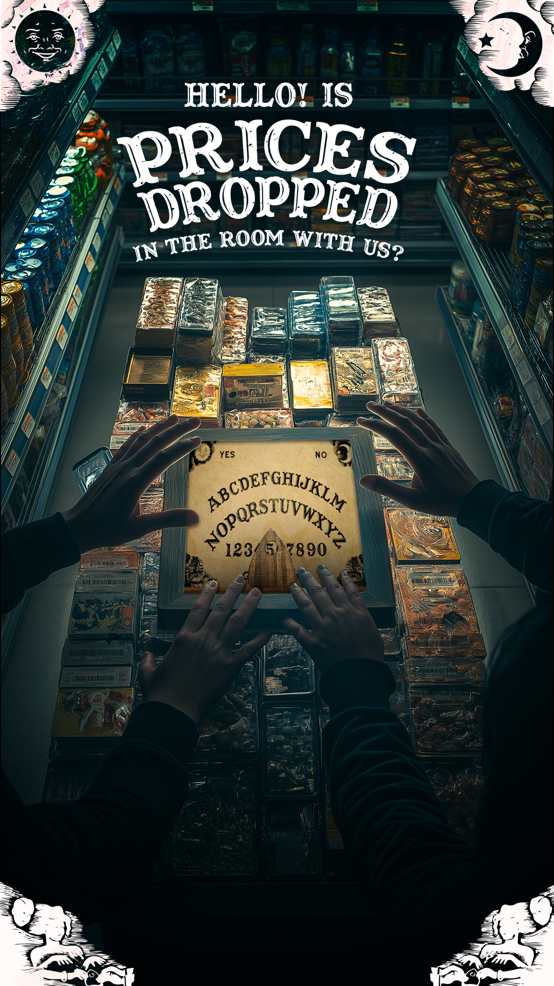 In supermarkets, low prices are ghosts — always promised, never present. “The Ghost Prices Séance” drags shoppers into absurd rituals, Ouija boards in hand, summoning phantom discounts that vanish at checkout. The series turns retail lies into performative spectacle, mocking consumer faith and exposing commerce as theater, where belief outweighs reality and the hunt itself becomes art.
