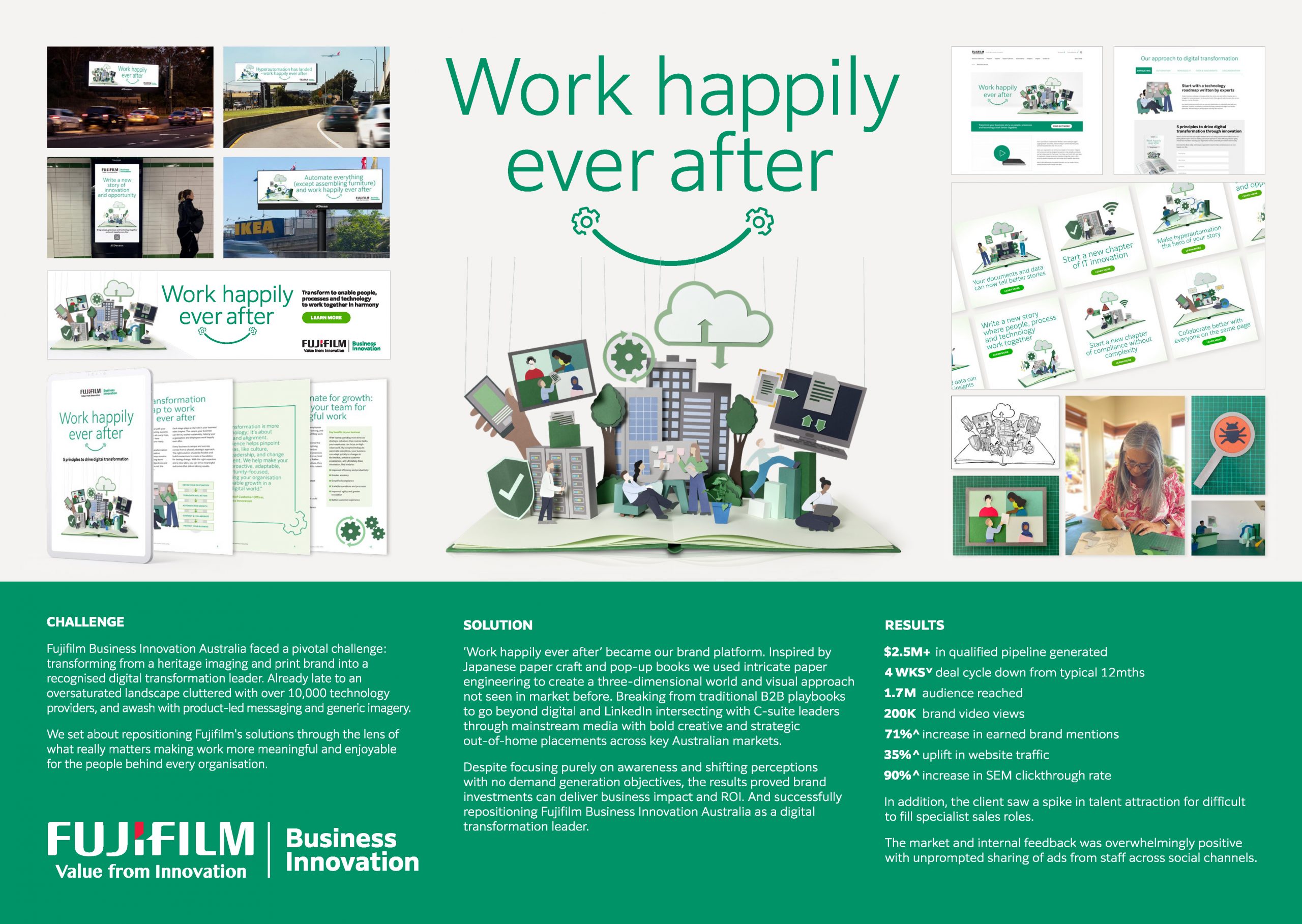 “Work Happily Ever After” reframed digital transformation as a human outcome, not a technical upgrade — repositioning Fujifilm BI as a modern, consultative partner that helps organisations move forward with clarity, optimism, and confidence.